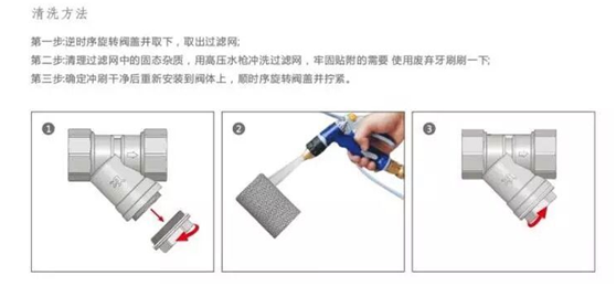 地暖每年在使用前應清洗一次過濾器。具體方法如下:首先關閉連接導管的進、回水閥門,然后打開過濾器、過濾網(wǎng)并清洗干凈,檢查過濾網(wǎng)有無破損及堵塞。如有損壞,應換上同規(guī)格的過濾網(wǎng),按原樣裝好即可。